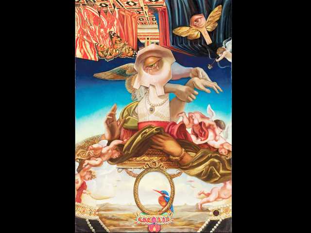 But as interesting as the collages are, the eye cannot help but be drawn to the shimmering, full-scale paintings on display, lush with detail and color, begging for prolonged study. A great student of mythology and the narrative traditions of painting, Baade is telling us a story in each fractured, layered work. "Triumph of Divine Love: The Eternal Mother," for example, blends bits of Renaissance masterwork by Botticelli and Rubens with nature symbolism and Surrealism, expressing a new icon of the great mother of creation.