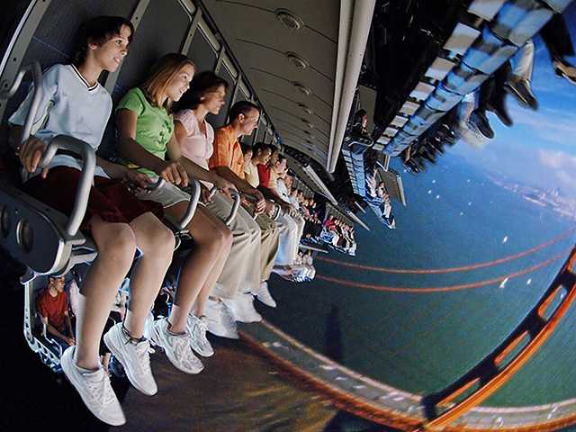 In Soarin’, you sit tight on a seat with a chest restraint, legs dangling much like modern roller coasters. On a concave screen before you, a video is projected wherein you are touring the world from the sky. Your row of seats tilts to look down at magnificent heights, and trembles or shakes when the landscape suggests it. You watch elephants run and smell the dirt and grass of their feet trampling the plains. You pass lush palm-dense islands and smell a coconut and the sea breeze. You visit Sydney, Australia and San Francisco, and fly over frozen landscapes where polar bears roamed, lumbering along the snow drifts like ghosts.